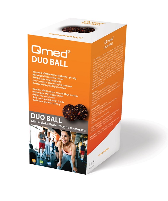 Piłeczka Qmed Duo Ball to świetny przyrząd do masażu całego ciała. Dzięki swojemu specjalnemu wyprofilowaniu idealnie nadaje się do miejsc o dużej krzywiźnie. Sprawdzi się zwłaszcza do masażu mięśni przykręgosłupowych, ale z jej pomocą można też efektywnie stymulować łydki, przedramiona czy szyję. Skutecznie redukuje ból i napięcie mięśni, w dodatku poprawia ukrwienie, co wiąże się z ich szybszą regeneracją. Jest również dobrym narzędziem zwiększającym mobilność ciała. Może być wykorzystywana profilaktycznie, by zapobiec niechcianej kontuzji, ale też stanowi element rehabilitacji po urazie. Model wykonano z pianki o podwyższonej twardości, co przekłada się na dużą wytrzymałość, w dodatku gwarantuje intensywną stymulację. Produkt jest odporny na pot i brud, przy tym jest łatwy w czyszczeniu. Podwójna piłeczka umożliwia samodzielny masaż także tylnych partii ciała, jest niezwykle poręczna i łatwa w użyciu, a nieduże gabaryty pozwalają zabrać ją w dowolne miejsce: do pracy, na trening, jak i zajęcia rehabilitacyjne.