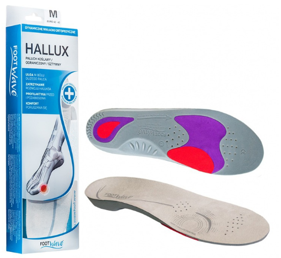 Model Footwave Hallux to kompleksowe wkładki, które są nie tylko skutecznym wsparciem przy problemach z paluchem koślawym, ale również korygują inne deformacje w obrębie stóp. Odpowiednie wyprofilowanie wpływa na ich prawidłowe ustawienie, z zachowaniem właściwej osi ruchu. Sprzyja temu korytkowa pięta i podparcie łuków podeszwowych. W dodatku stabilizują piętę i przeciwdziałają koślawości oraz przywracają prawidłową ruchomość stawu skokowego dolnego, jak również mobilizują ruchomość pierwszego promienia (palucha), czyli korygują główne powody powstawania haluksa. Podwójny amortyzator kierunkowy absorbuje wstrząsy tyłostopia, a płaska platforma działa stabilizująco. Zagłębienie pod haluksa przeciwdziała nadmiernemu naciskowi w najbardziej bolesnym miejscu. Wielozadaniowość wkładek Halux sprawia, że zyskały dużą popularność wśród klientów i są często wybieranym modelem.