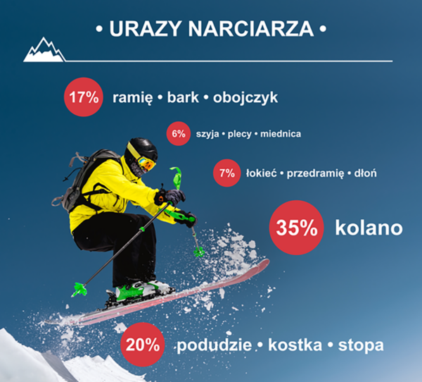 Przewagę pod względem częstotliwości występowania urazu kolana u narciarzy, względem pozostałych części ciała, przedstawia poniższa grafika: